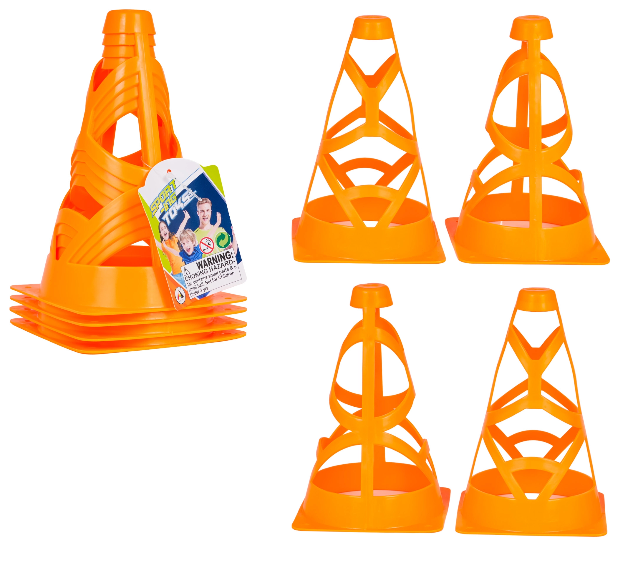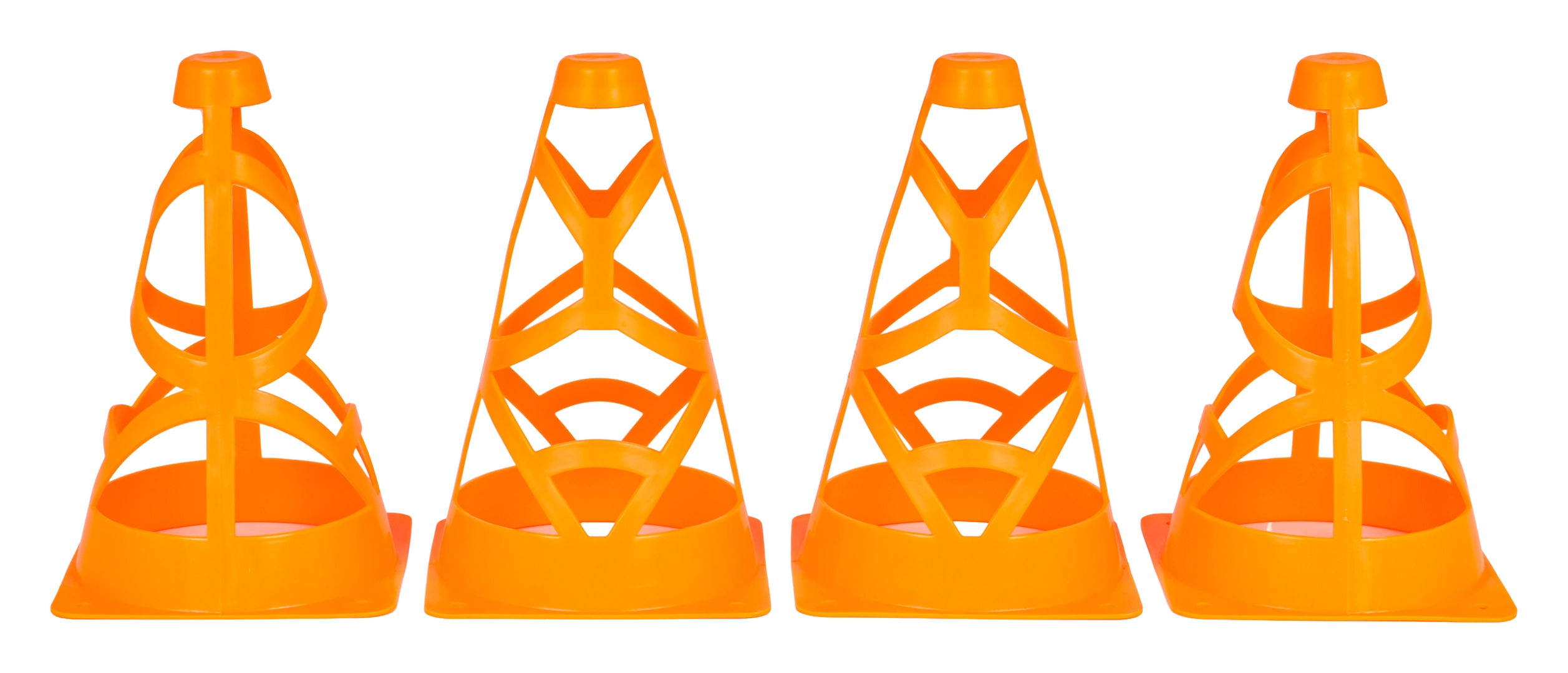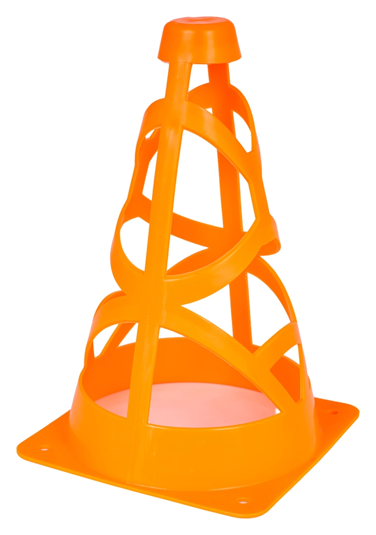 Conuri de antrenament universale, în portocaliu intens, care ajută la marcarea traseelor, zonelor și obstacolelor în jocuri și sport. Datorită construcției ușoare din plastic, se transportă facil, iar forma stivuibilă economisește spațiu la depozitare. Structura deschisă de tip „grilaj” și găurile din colțurile bazei permit ancorarea sigură și reduc rezistența la vânt.