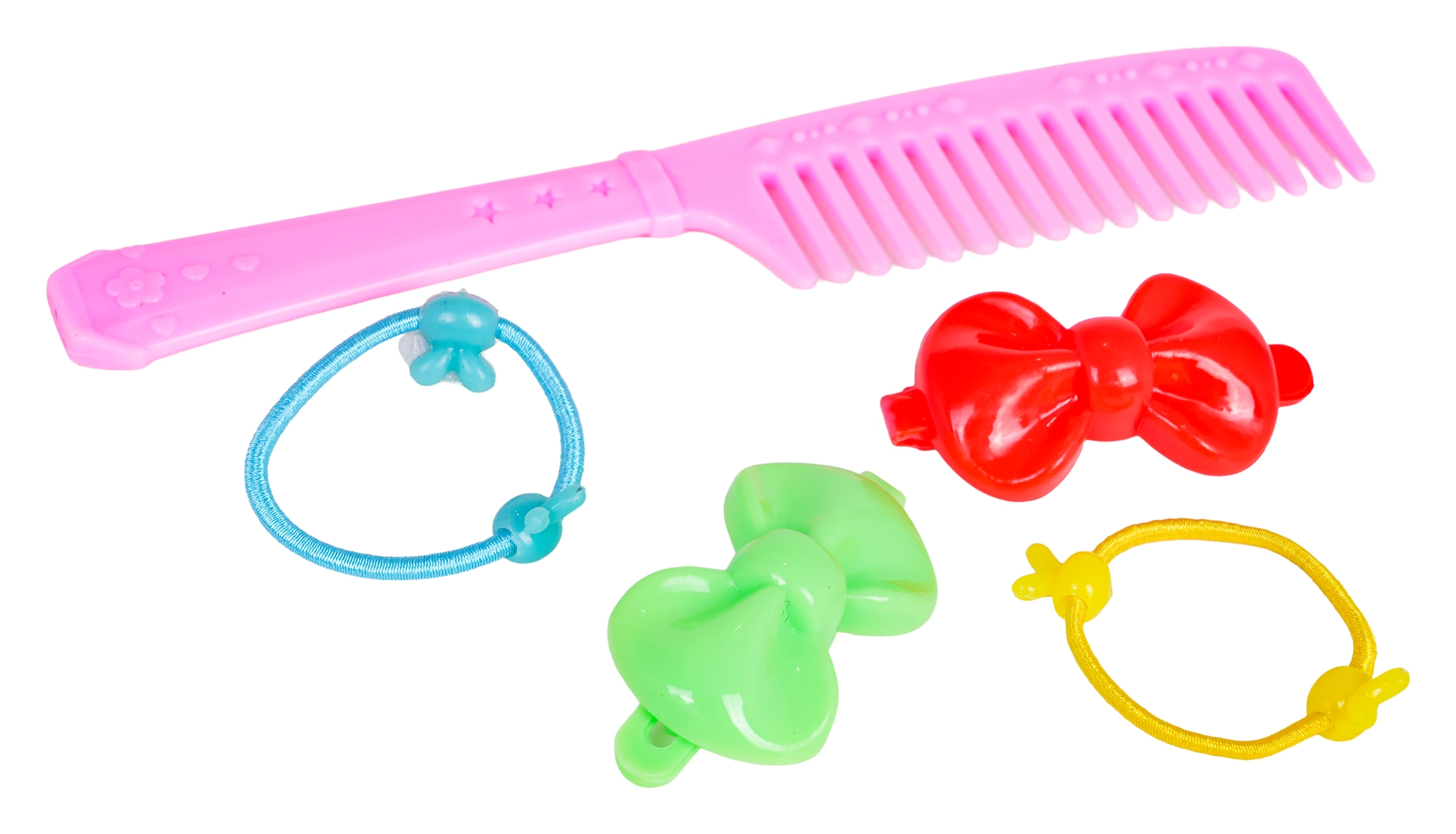 Pieptenele, două agrafe și două elastice permit pieptănarea, decorarea și schimbarea look-ului păpușii după imaginația copilului.