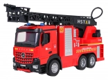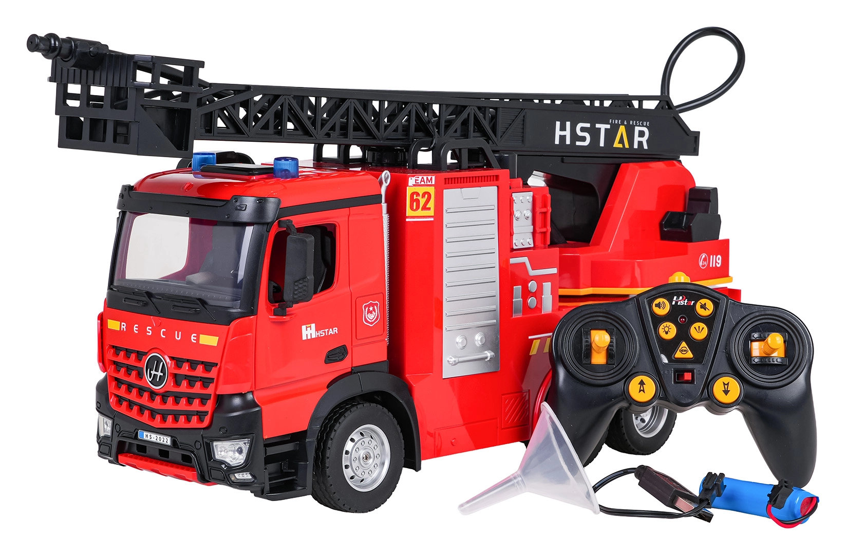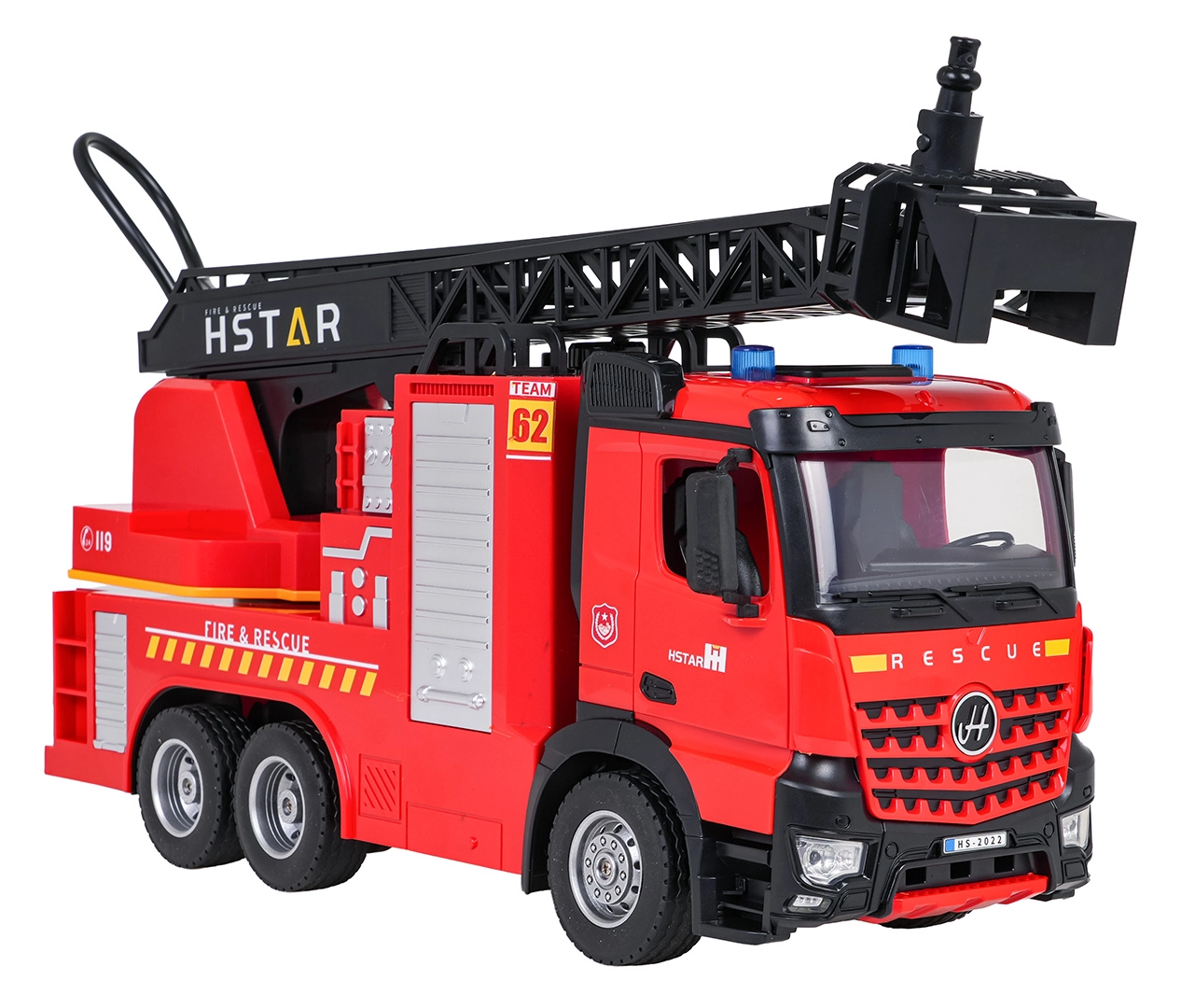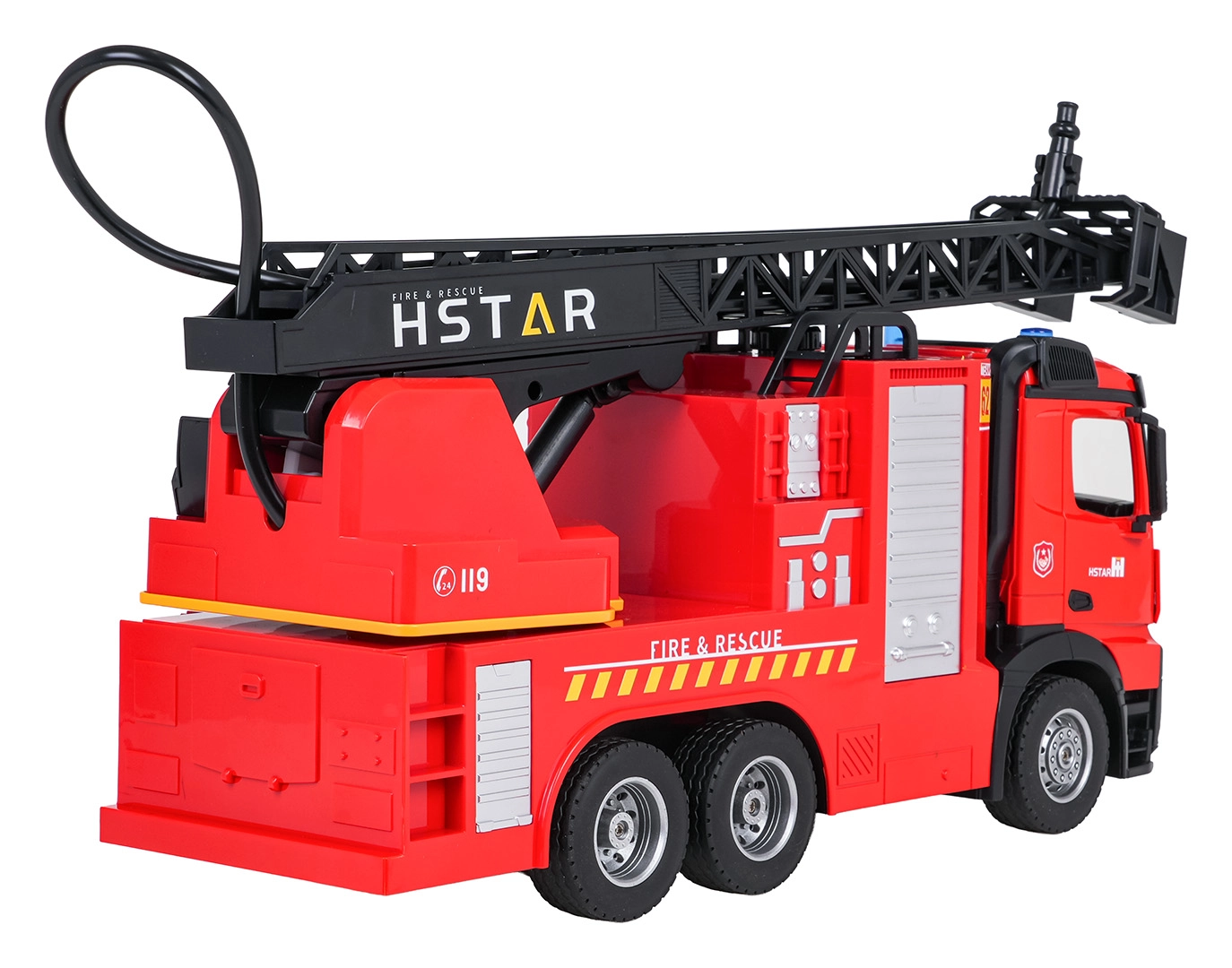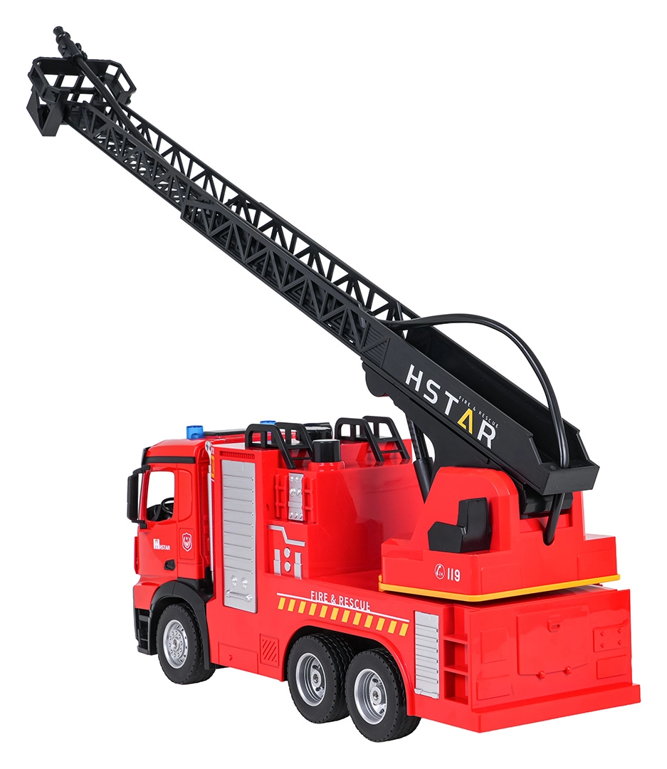 Acest vehicul de pompieri detaliat îi va încânta pe micii salvatori cu funcții realiste. Cu ajutorul telecomenzii, vehiculul se deplasează în toate direcțiile și permite concomitent ridicarea și rotirea scării. După umplerea rezervorului și apăsarea butonului de pe telecomandă, din furtun începe să iasă o ceață fină de apă, care imită fidel stingerea incendiilor.
