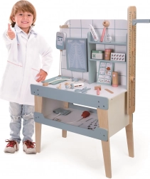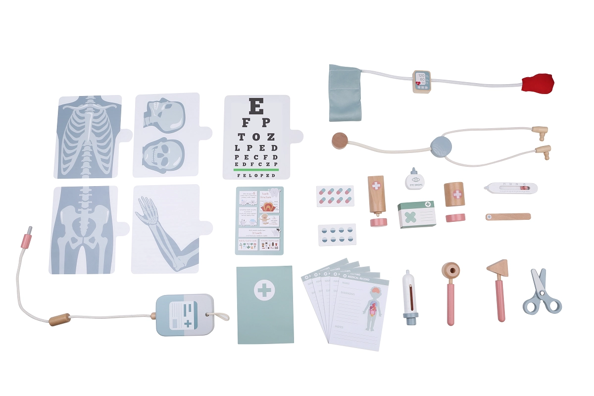 Acest set de joc de rol susține imaginația, interacțiunea socială și ajută la reducerea fricii de vizita la medic. Instrumentele realiste din lemn de calitate și alte materiale îi învață pe copii să recunoască instrumentele medicale, să planifice examinările și să aibă grijă de „pacienți”.