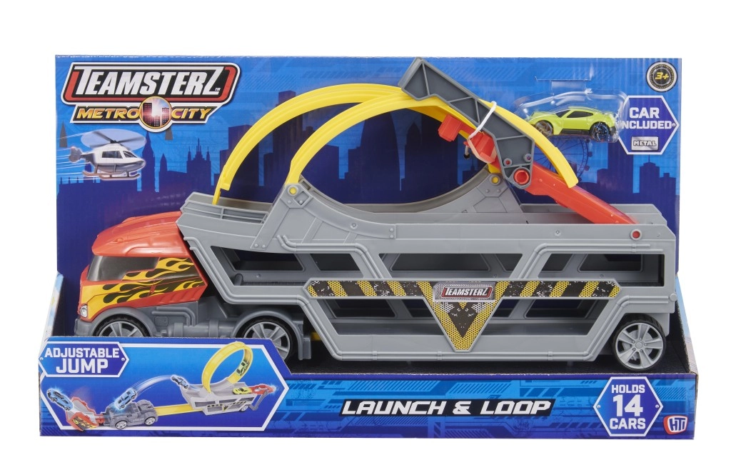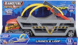 Transformă orice cursă în acțiune. Transportorul TEAMSTERZ nu servește doar la transportul mașinuțelor, ci și ca pistă de joc completă. În partea superioară găsești loopingul galben, ușor de montat, și rampa pentru sărituri palpitante. Datorită lansatorului cu mecanism de întindere trimiți mașinuța prin buclă la viteză maximă.