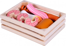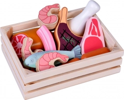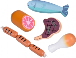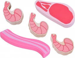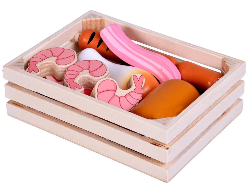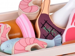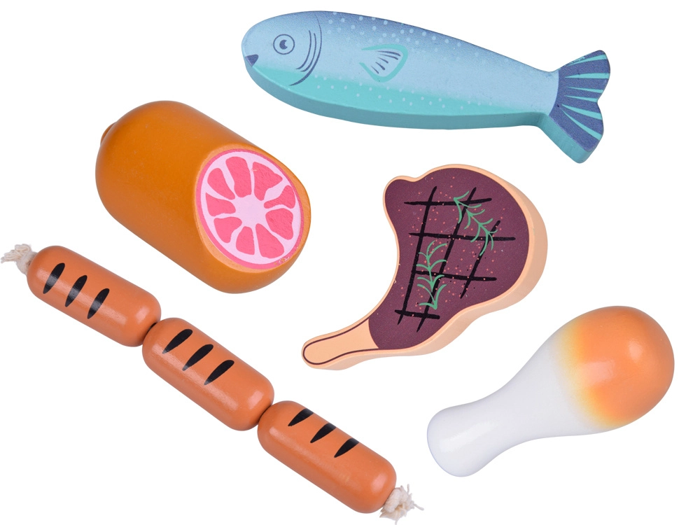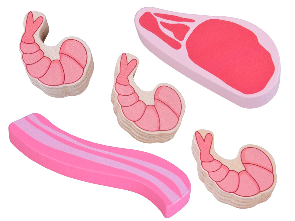 Friptură, crenvurști, salam, bacon, ciocănel de pui, pulpă la grătar, pește și 3x crevete – o combinație variată pentru gătit și joacă de-a magazinul la nesfârșit.