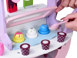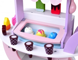 Drăguțul stand de înghețată din lemn, în culori pastel, îi va încânta pe micii iubitori de înghețată și de jocul de-a magazinul. Oferă 8 tipuri diferite de înghețată, biluțe magnetice pentru cornete, o cutie cu capac rabatabil, copertină în dungi și mâner cu roți pentru mutare ușoară. Susține imaginația, motricitatea fină și jocul social.