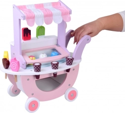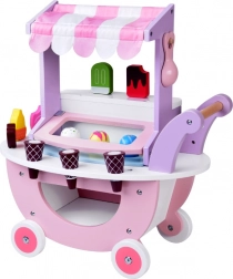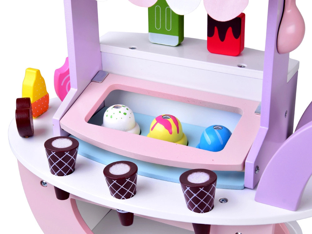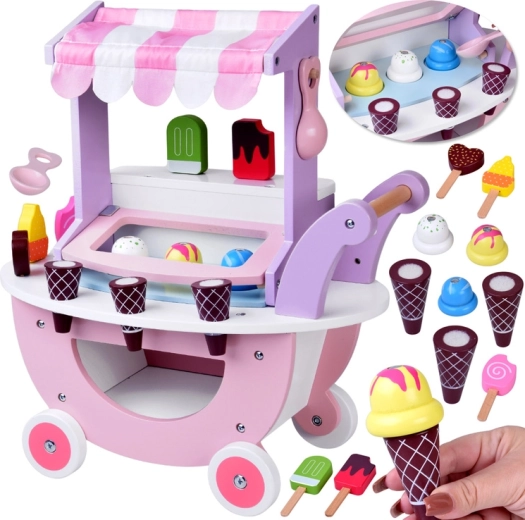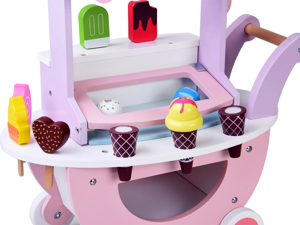 Standul are capac rabatabil cu compartiment interior pentru accesorii, copertină decorativă în dungi și mâner robust pentru împins sau tras. Datorită roților, copiii își pot deschide gelateria mobilă oriunde – în cameră, pe hol sau la grădiniță.