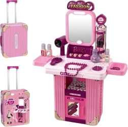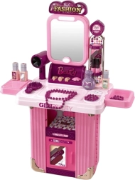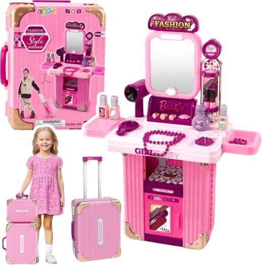 Măsuță de toaletă 2‑în‑1 pentru copii, într-un troler practic, care după deschidere se transformă într-o măsuță de cosmetică fermecată. Oferă oglindă iluminată, efecte sonore și un set bogat de accesorii pentru jocul de salon de înfrumusețare. Ușoară, mobilă datorită roților și mânerului telescopic, realizată din materiale sigure – susține creativitatea, imaginația și motricitatea fină.