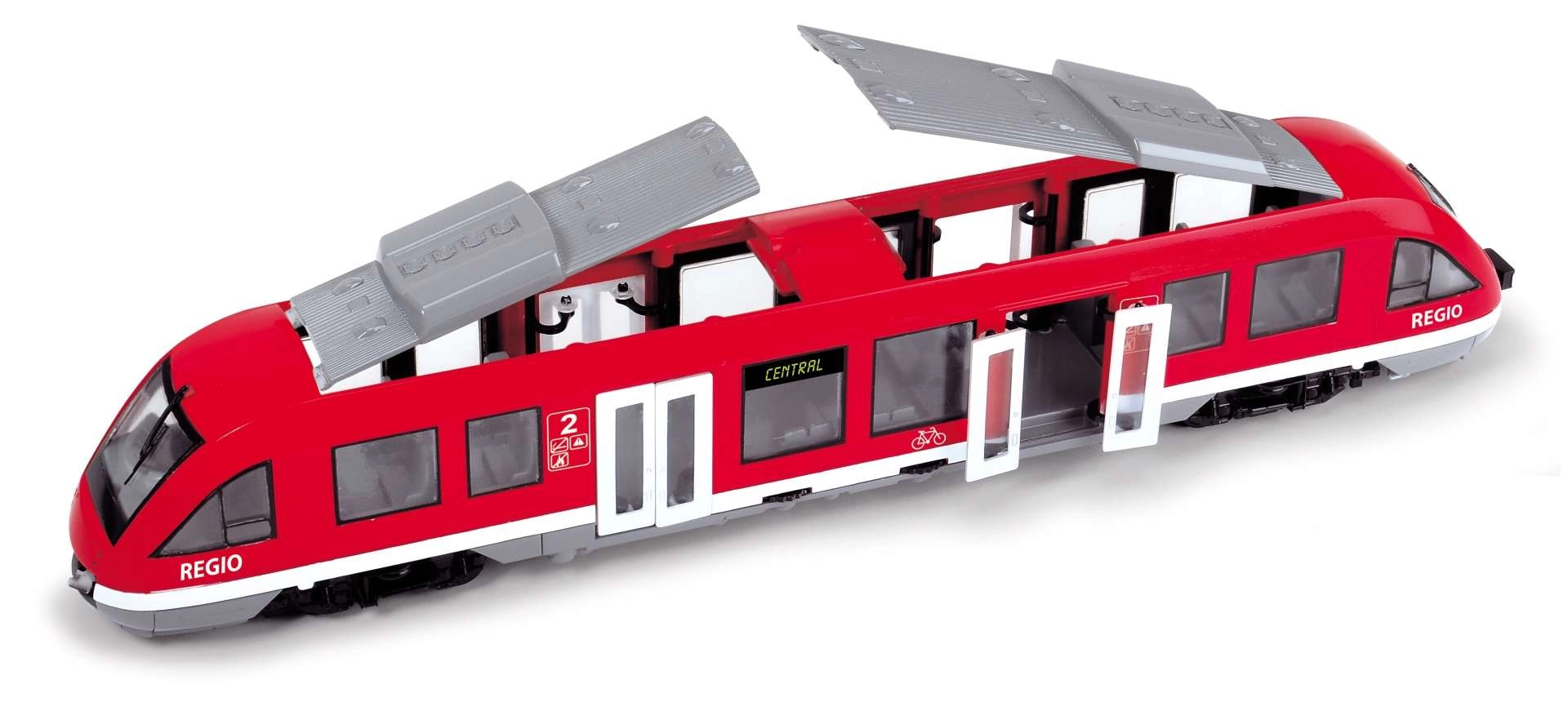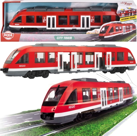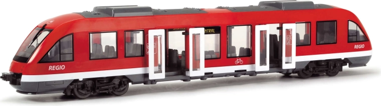 Trenul urban REGIO roșu de la DICKIE TOYS îi va încânta pe micii pasionați de cale ferată. Oferă uși care se deschid acționate cu un rotiț, roți libere pentru o deplasare lină pe suprafețe plane și un interior detaliat cu scaune și cabina mecanicului. Jucărie ideală pentru copii de la 3 ani, cu accent pe realism și durabilitate.