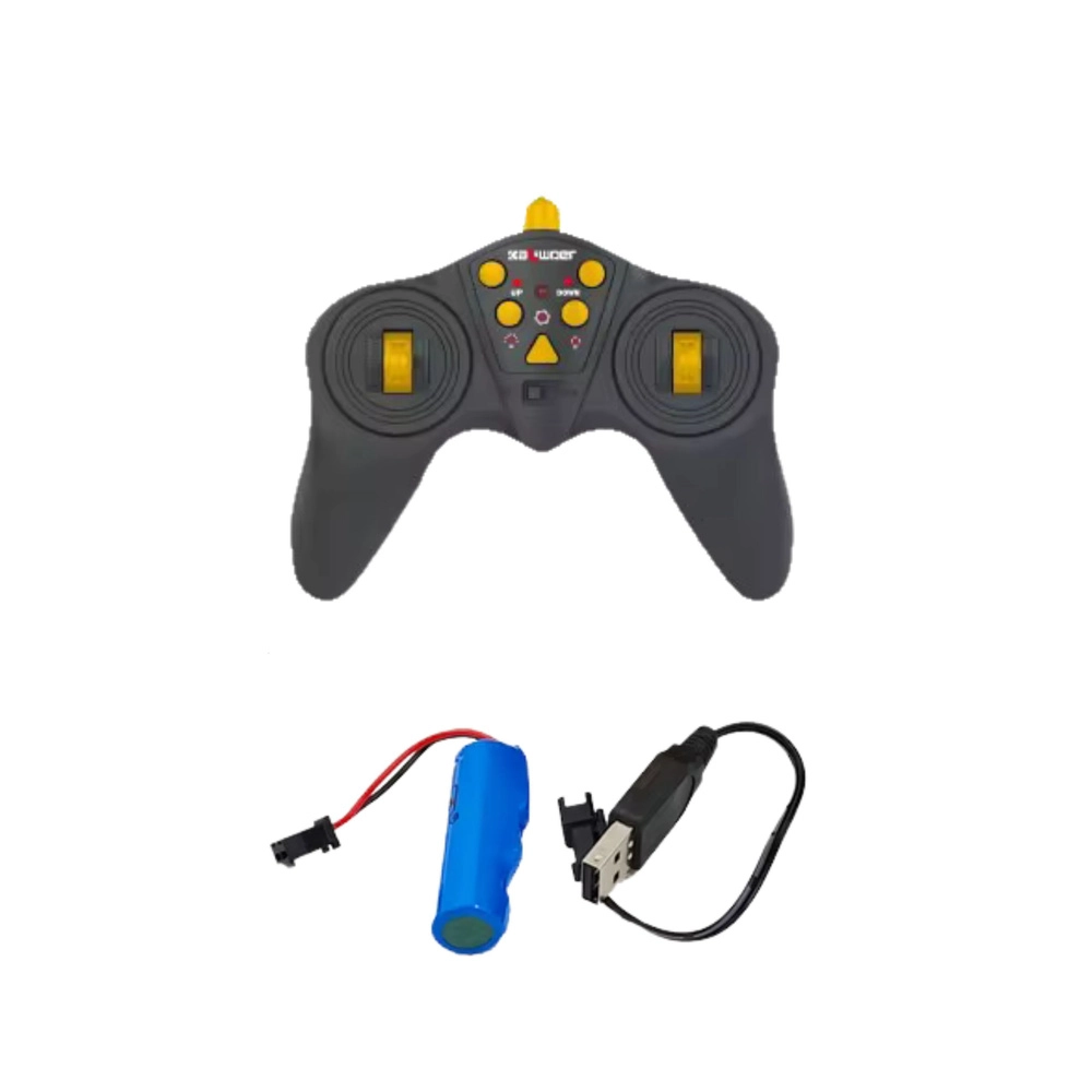 În pachet găsești o telecomandă cu două joystick-uri, acumulator reîncărcabil 3,7 V și cablu USB – trebuie doar să introduci baterii AA în telecomandă și ești gata de plecare.
