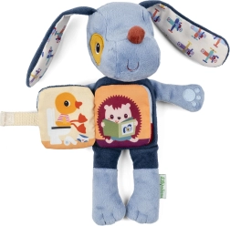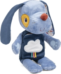 Cățelul de pluș Jules este jucăria ideală pentru dezvoltarea motricității fine, a percepției senzoriale și a imaginației. Corpul foarte moale, cu suprafață catifelată, invită la îmbrățișat, în timp ce cărticica textilă de pe burtică prezintă o mică poveste care distrează copilul acasă sau în călătorii. Elementele luminoase de pe nor și pe lăbuțe strălucesc ușor în întuneric și ajută la crearea unei senzații de siguranță la culcare.