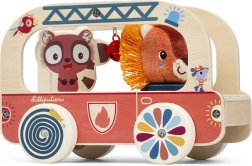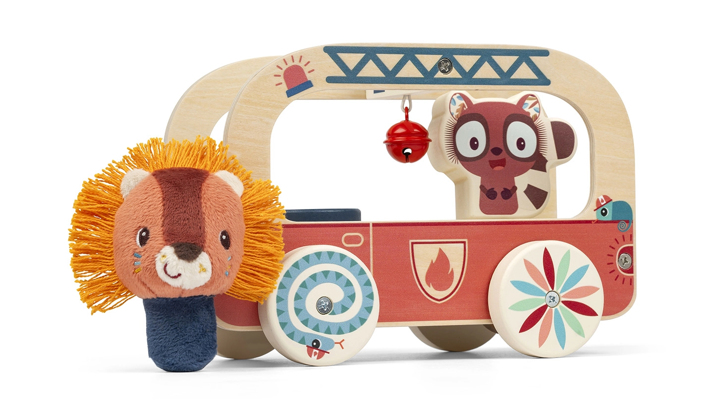 Oferă-i micuțului tău primele aventuri cu camionul de pompieri din lemn Lilliputiens. În timpul mersului, prietenul animal din interior se învârte și atinge ușor clopoțica suspendată – clinchetul vesel susține percepția sunetului, coordonarea și imaginația. Vehiculul se manevrează ușor datorită roților care se rotesc lin, iar șnurul poate fi detașat oricând.