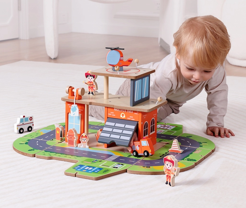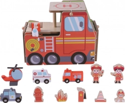 Jucăria este realizată din lemn de calitate și elemente metalice pentru durabilitate sporită. Conține 13 piese colorate, inclusiv figurine de pompieri, vehicule, accesorii și echipamente de salvare. Este grozavă pentru copii de la 3 ani, susținând motricitatea fină, coordonarea mână–ochi și învățarea lucrului în echipă.