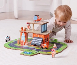 Această stație de pompieri din lemn oferă copiilor o lume bogată a aventurilor de salvare. Datorită soluției ingenioase 2 în 1, o pliezi ușor într-o mașină de pompieri compactă, astfel încât copiii o pot lua oriunde. Stația are porți de ieșire, drum și zone de joacă pentru vehicule și figurine – ideală pentru joc liber și dezvoltarea imaginației.