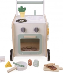 Acest premergător multifuncțional din lemn servește ca sprijin pentru primii pași și, totodată, ca centru de joacă complet, cu accesorii de bucătărie. Copiii își exersează coordonarea mână–ochi, echilibrul și motricitatea fină, în timp ce descoperă lumea gătitului și a jocurilor de rol. Butoanele rotative ale cuptorului emit un clic plăcut, ușițele se pot deschide, iar spațiul de depozitare practic nu lipsește pentru accesorii.