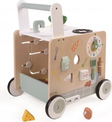 Datorită cadrului robust din lemn, premergătorul este stabil și durabil, iar roțile cauciucate asigură o mișcare silențioasă și sigură pe podea. Pe cele patru laturi îi așteaptă multe activități: sortare de forme (alimente), roți dințate rotative, labirint cu legume, chiuvetă cu baterie, plită și cuptor transparent. Premergătorul este un cadou ideal pentru copiii de la 12 luni.