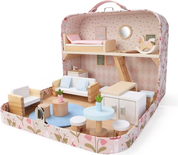 Descoperă o lume magică pentru călătorii: o căsuță portabilă pentru păpuși ascunsă într-o valiză elegantă. După deschidere, se transformă într-o locuință primitoare cu mobilier și decorațiuni miniaturale. Ideală pentru joacă acasă sau în deplasare, stimulează creativitatea și imaginația copiilor. Include un cal balansoar, pătuț, canapea, fotoliu, scară către etaj și alte accesorii. Valiză portabilă, accesorii bogate, ușor de transportat și distracție pentru copii de la 3 ani.