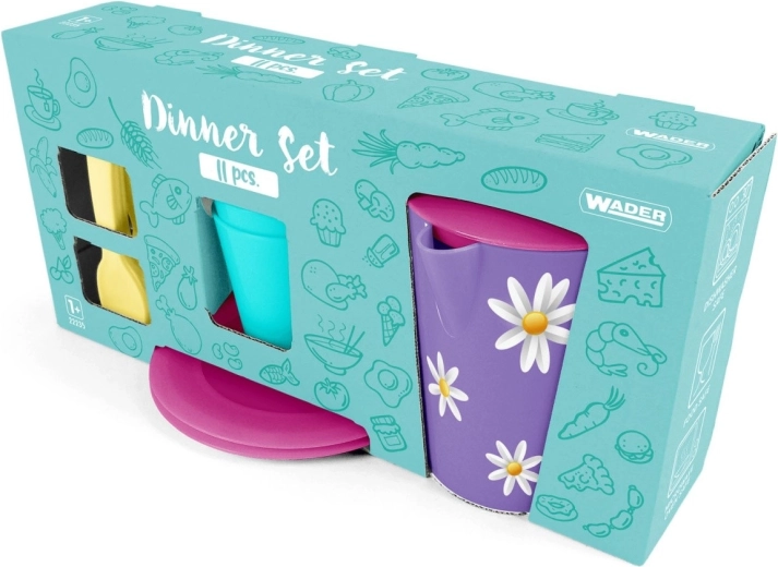 Micul set de masă Party Time este ideal pentru micile bucătărese și micii bucătari care adoră gătitul și organizarea petrecerilor pentru copii. Setul conține un ceainic cu grafică IML cu margarete drăgălașe, 2 ceșcuțe, 2 farfurioare, 2 furculițe, 2 cuțite și 2 lingurițe – în total 11 piese. Datorită ambalajului elegant, setul este grozav și ca dar.