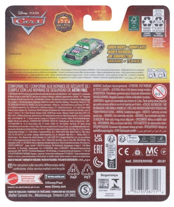 Caroserie verde intensă, numărul 86 și stickere realiste ale sponsorilor, exact ca personajul CHICK HICKS din Cars 3.