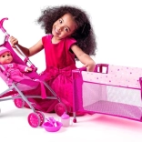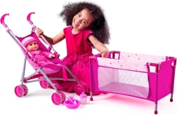 Acest set frumos include tot ceea ce copilul dumneavoastră are nevoie pentru a îngriji păpușa preferată. Include un cărucior sport cu cadru metalic, practic datorită manevrării ușoare. De asemenea, este inclus un pătuț de călătorie, ideal pentru joacă acasă sau în exterior.