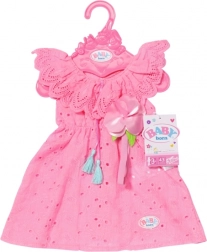 Rochia în nuanță de roz, cu guler încrețit, șnururi decorative și ciucuri, oferă un aspect delicat oricărei păpuși BABY born.