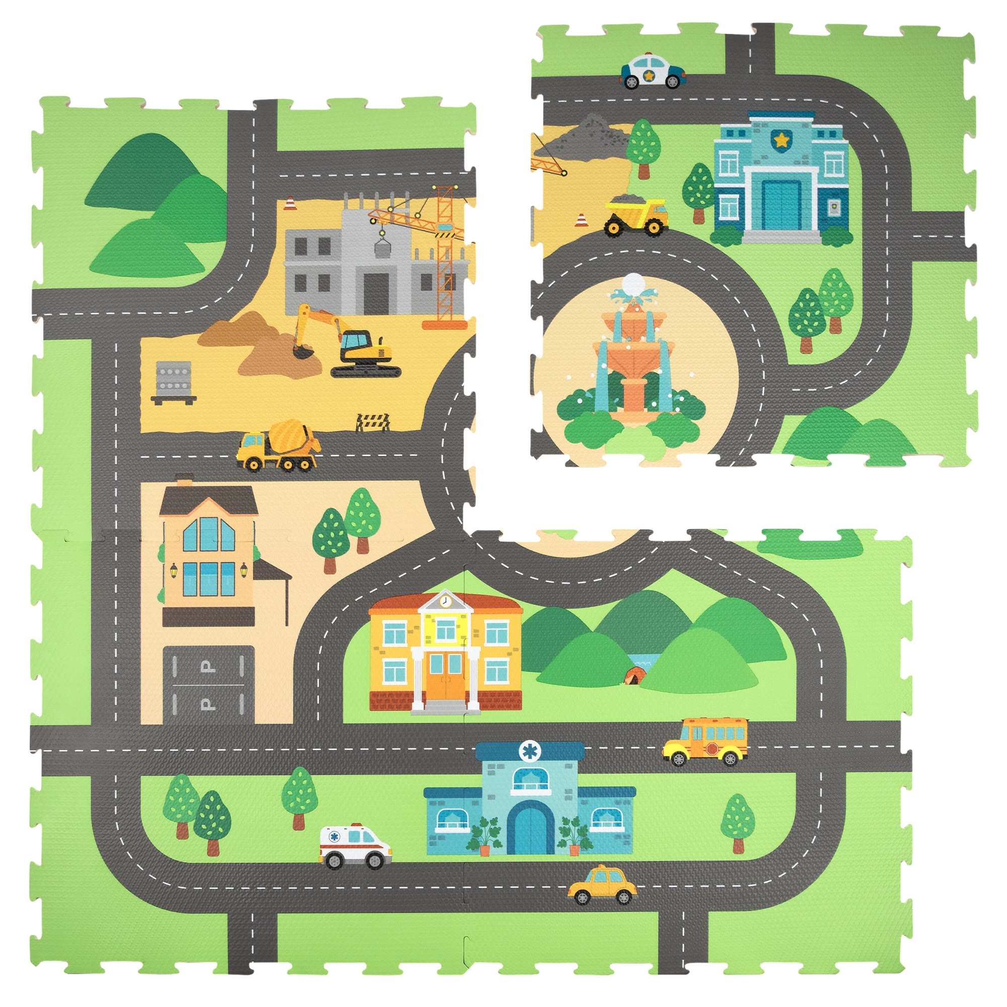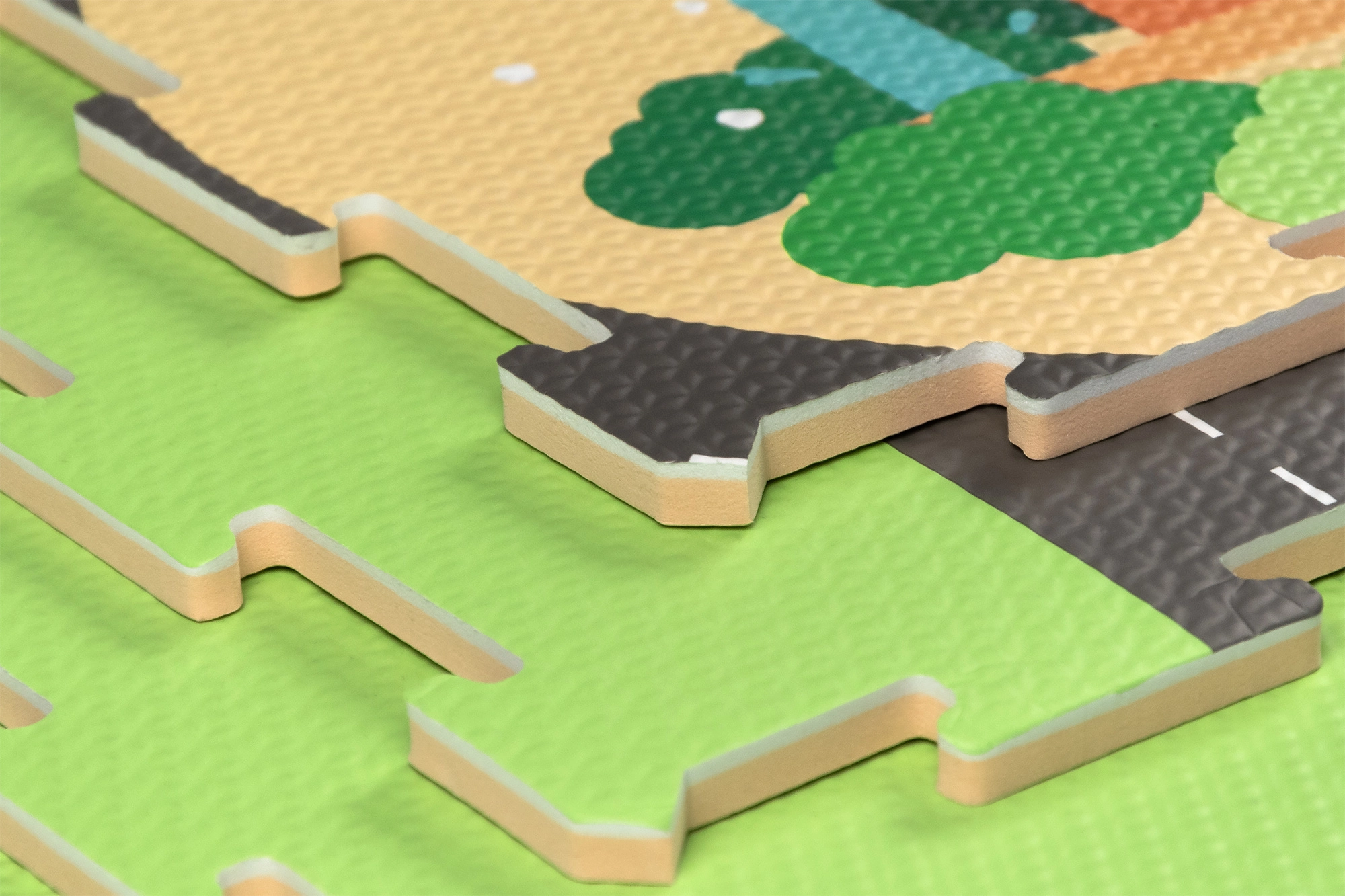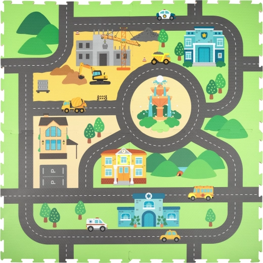 Descoperă covorașul din spumă HUMBI, distractiv și sigur, cu motiv de străzi urbane. Setul de 4 piese mari creează o suprafață de aprox. 120 × 120 cm și oferă o suprafață moale, izolatoare și antiderapantă pentru joacă. Copiii își pot asambla propriul orășel și drumuri, dezvoltând creativitatea și motricitatea fină. Fabricat din spumă EVA durabilă fără ftalați, formamidă, BPA și PVC.