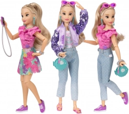 În pachet găsiți două ținute complete și o mulțime de accesorii pentru combinații nesfârșite. De la jacheta mov strălucitoare cu mâneci cu paiete, la fusta cu flori, până la ochelarii stilați și poșetă – totul asortat în stil marin.