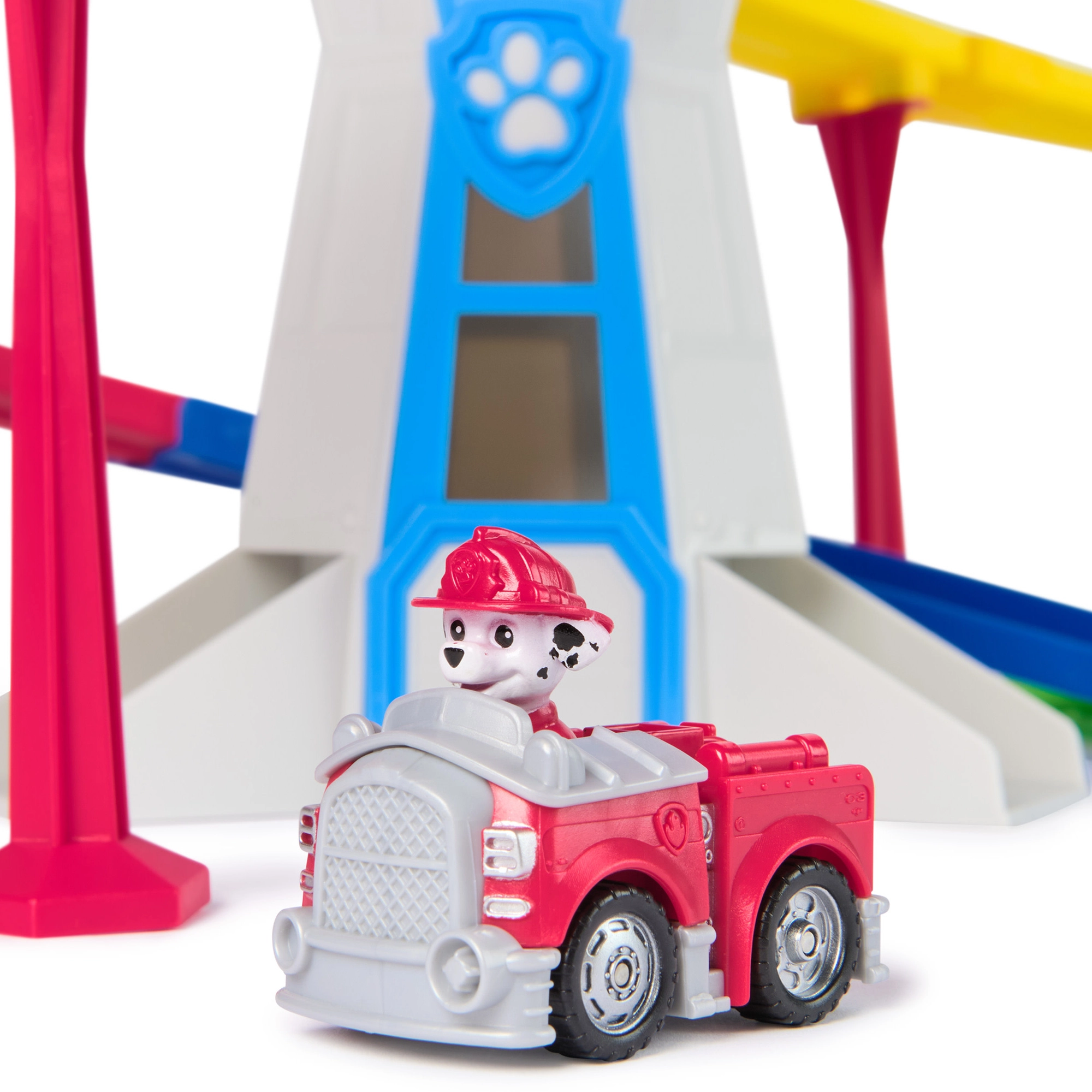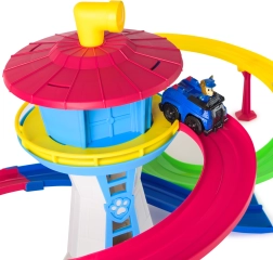 Această set de joacă robust și colorat, inspirat din lumea PAW PATROL, îi poartă pe copii în Adventure Bay. Turnul, cu detalii realiste și două rampe late, permite lansarea vehiculelor direct în acțiune – pune mașinuța în vârf și pornește într-o misiune de salvare.