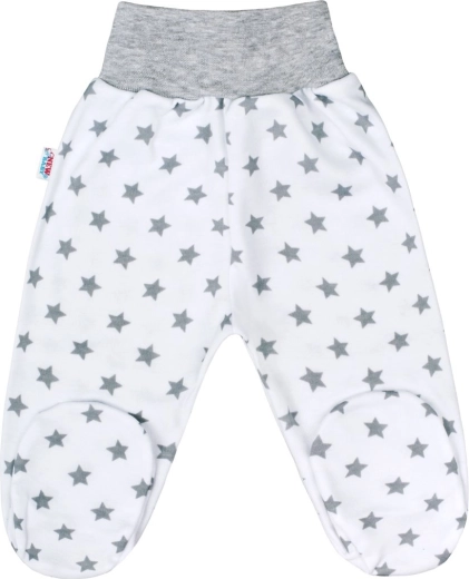 Pantalonii confortabili pentru bebeluși tip semisalopetă NEW BABY Classic II, în culoare gri cu model de steluțe, oferă material din bumbac moale și de calitate și talie largă, care nu strânge, delicată cu burtica bebelușului. Ideali pentru purtare zilnică și un somn liniștit.