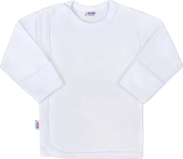 Bluziță practică pentru bebeluși New Baby Classic II în culoare albă, confecționată din 100% bumbac, delicată cu pielea copilului și ideală pentru purtare zilnică. Are închidere comodă cu capse pe umăr și lateral și manșete rulate practice pentru ajustare ușoară.