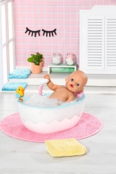 Oferă-i păpușii tale relaxare în cada stilată BABY born, cu design alb‑albastru și valul iconic. Copiii se vor bucura de adevărate jocuri acvatice datorită capului de duș funcțional – dacă cada este umplută, din duș curge apă reală. Prin apăsarea unui buton se aprind efecte luminoase colorate și se aud sunete autentice de stropi, amplificând atmosfera băii.