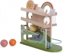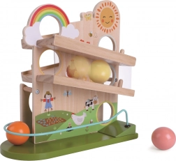 Această pistă de bile creativă, cu design rural proaspăt, transformă orice joacă într-o aventură colorată. Copiii urmăresc cum bilele pornesc pe pante cu înclinații diferite, dispar în orificii și apar din nou – totul pe fundalul ilustrațiilor vesele cu soare, curcubeu și animăluțe. Baza stabilă și piesele din lemn finisate fin asigură o manipulare sigură chiar și pentru cei mai mici.