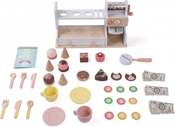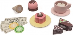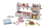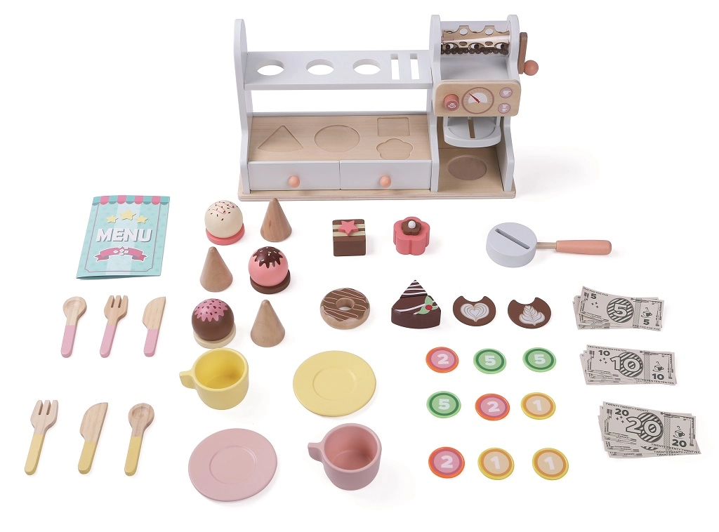 Setul este realizat din lemn rezistent, în nuanțe pastelate delicate, și oferă accesorii bogate: cești cu farfuriuțe, lingurițe, tacâmuri, prăjituri, înghețate și alte elemente care susțin jocul de rol, dezvoltarea motricității fine, a abilităților sociale și a expresiei verbale.