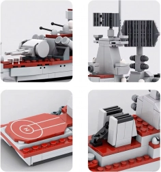 Acest set de construcție oferă ore de distracție la asamblare și un rezultat impresionant pe raft. Datorită pieselor care se îmbină ferm, veți crea o structură stabilă cu echipare bogată – de la radare și turele de tun până la suprastructuri de punte. Aspectul realist este susținut de autocolantele incluse, care conferă modelului final o notă autentică.