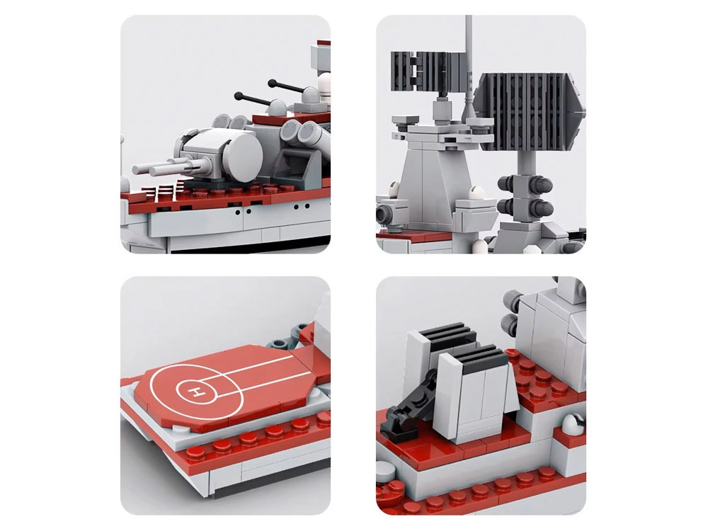 Echiparea bogată a modelului, inclusiv tunuri, radare și elemente de punte, asigură un aspect impresionant și fidel al navei finalizate.