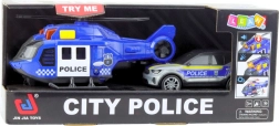 Setul City Police va încânta micii fani ai serviciilor de salvare. Conține o elicopteră de poliție cu efecte de lumină și sunet și o mașină de poliție cu mecanism de pornire. Elicopterul are rotori rotativi, uși care se deschid și un cârlig de salvare, astfel încât copiii pot trăi misiuni pline de acțiune, urmăriri și intervenții. Fabricat din materiale sigure și rezistente, ideal pentru joacă atât acasă, cât și afară.