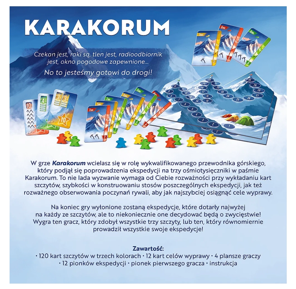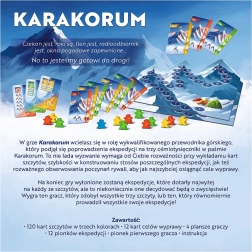 Pornește într-o expediție plină de aventură în masivul Karakoram în jocul de societate captivant de la Reiner Knizia. În rolul unui lider montan experimentat, planifici ascensiuni pe trei optmiari, unde contează tactica la plasarea cărților, rapiditatea în construirea pachetelor de expediție și observarea atentă a adversarilor. Ideal pentru iubitorii de jocuri strategice și tematici de alpinism.