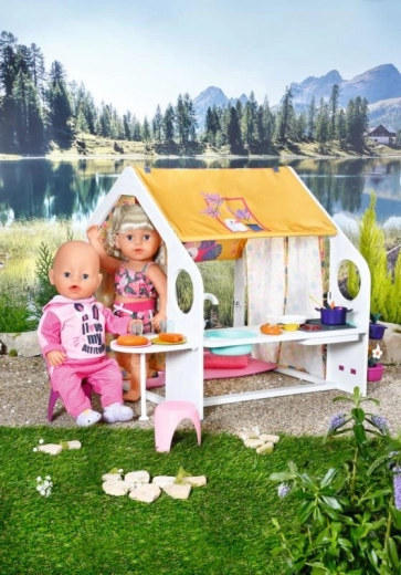 Căsuța de weekend pentru păpuși BABY born este un excelent mediu pentru joaca de-a glampingul. Datorită pereților laterali galbeni care pot fi deschiși, obțineți suficient spațiu pentru toate activitățile de joacă.