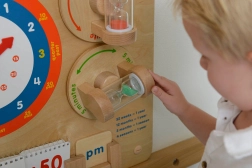 - Ceas analogic cu ace rotative, clepsidră de 1 min și 5 min, etichete ale unităților de timp