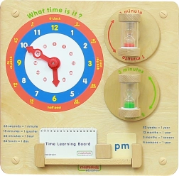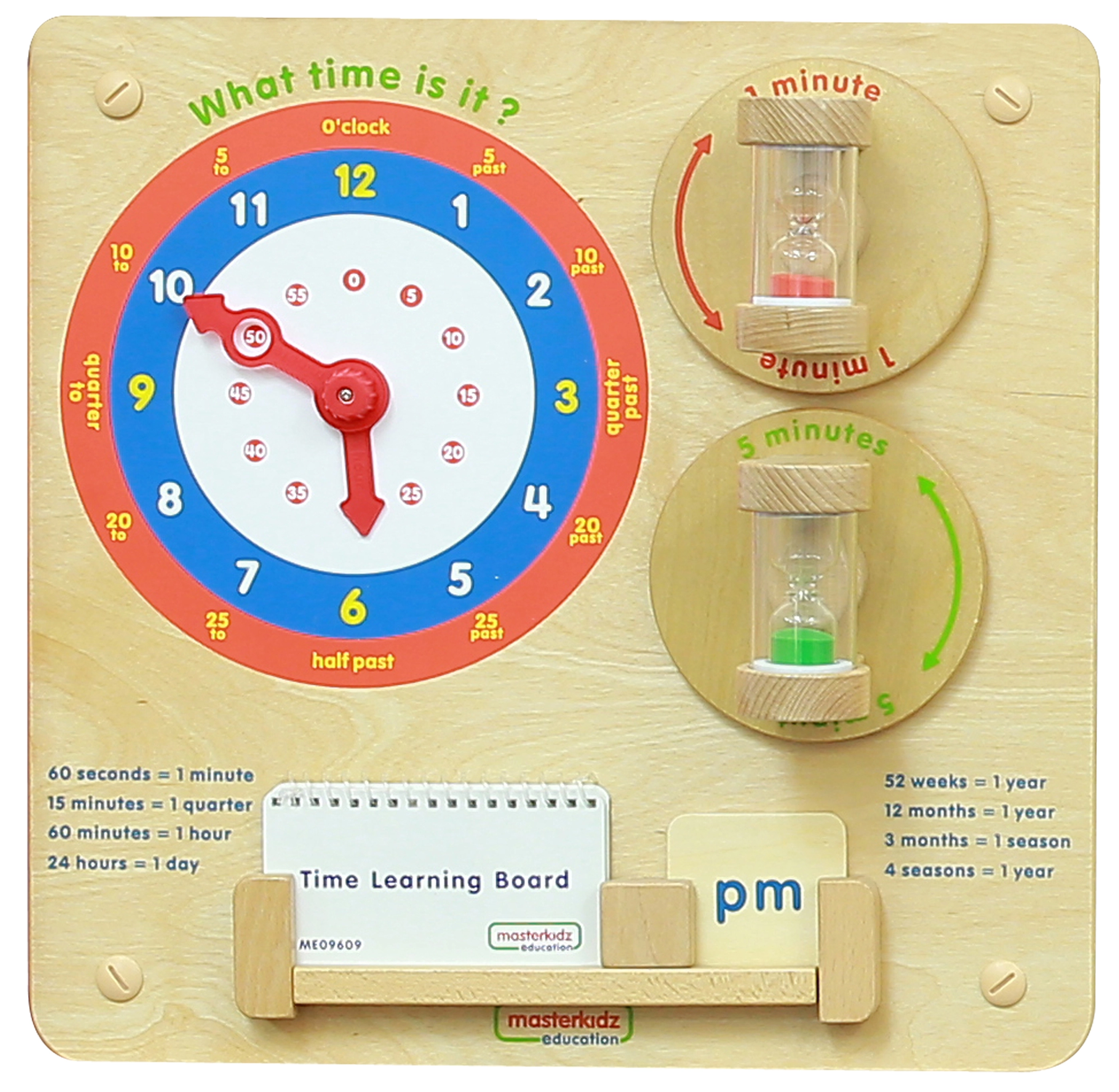 Tabla educațională din lemn MASTERKIDZ îi învață pe copii să citească timpul de pe ceasurile clasice, să înțeleagă minutele, orele și zilele și să perceapă durata timpului cu ajutorul a două clepsidre (1 și 5 minute). Construcția rezistentă pentru perete sau pentru sistemul Masterkidz Flex, ace mobile și marcaje clare susțin gândirea logică, motricitatea fină și jocul independent.