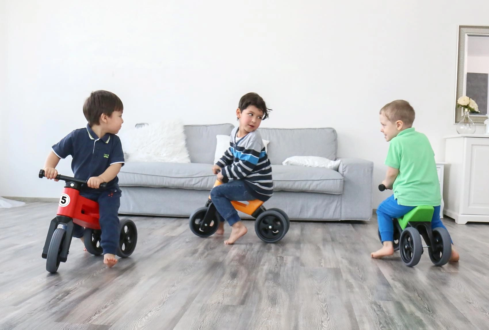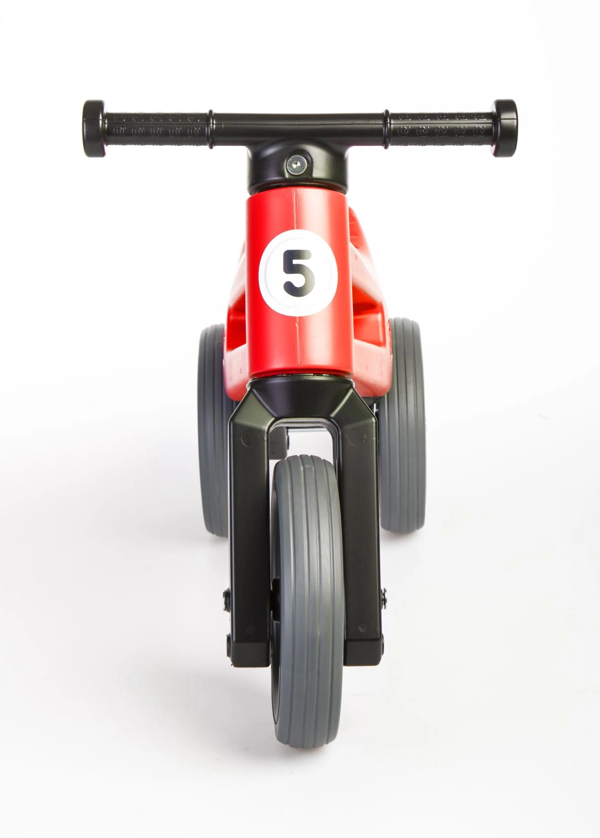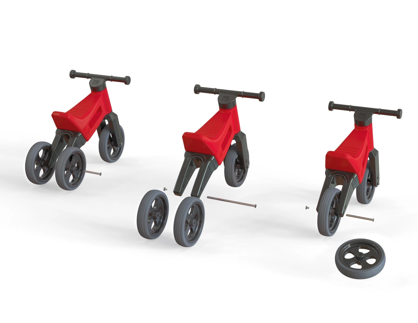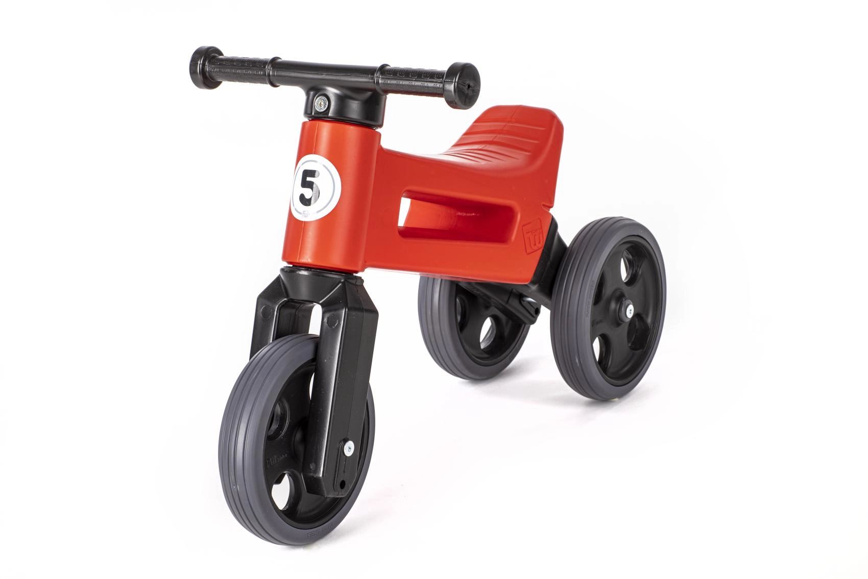 Bicicleta fără pedale cehă originală FUNNY WHEELS Rider Sport este concepută pentru a facilita copiilor primele etape către mersul pe bicicletă. Datorită sistemului 2-în-1, o transformi în câteva minute din tricicletă în bicicletă cu două roți, iar cu cele două poziții de înălțime ale șeii (diferență de 3 cm) însoțește copilul în diferite etape de creștere.
