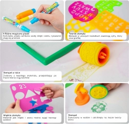 - Accesorii bogate: markere cu apă, rolă, ștampile și șabloane.