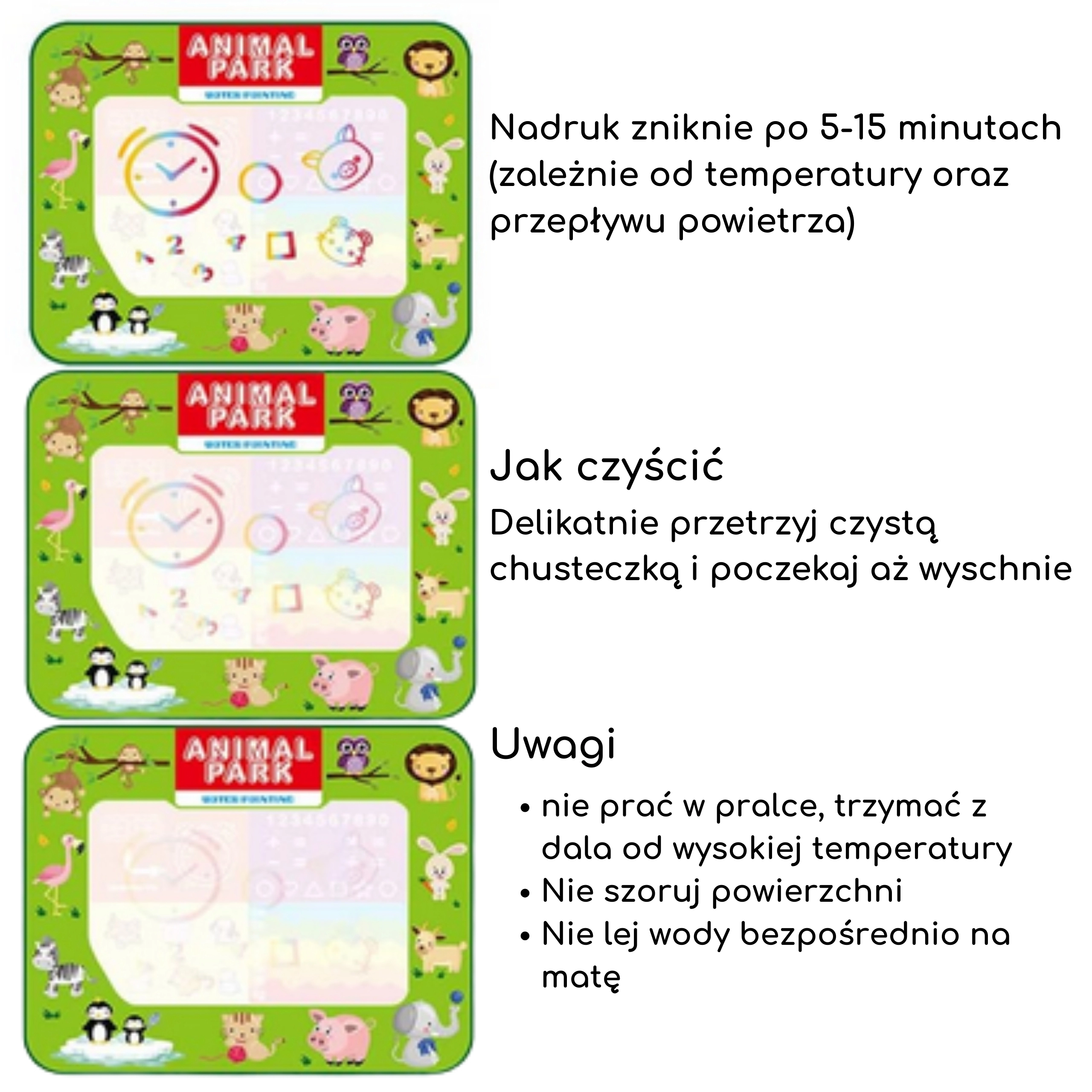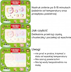 Covorașul cu apă Woopie Animal Park este alegerea ideală pentru copiii de la 3 ani. Datorită tehnologiei pe bază de apă se desenează fără cerneală și culori – doar cu apă, deci fără pete și murdărie. Imprimarea pe ambele fețe oferă conținut bogat pentru învățarea alfabetului, cifrelor, formelor, animalelor și a bazei matematicii și a citirii ceasului. Dimensiunea mare 100 × 80 cm este excelentă pentru creație individuală sau joacă împreună cu frații.