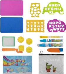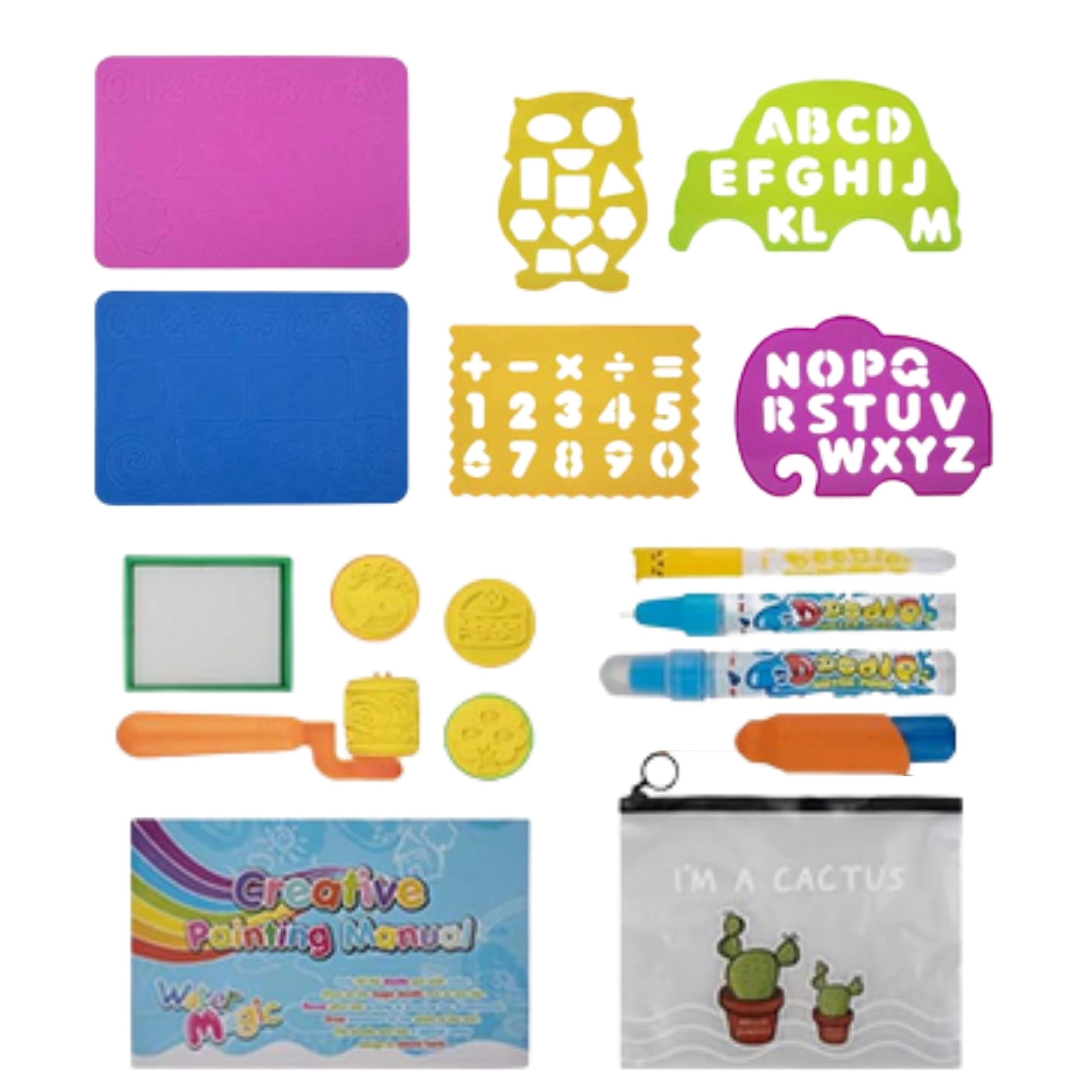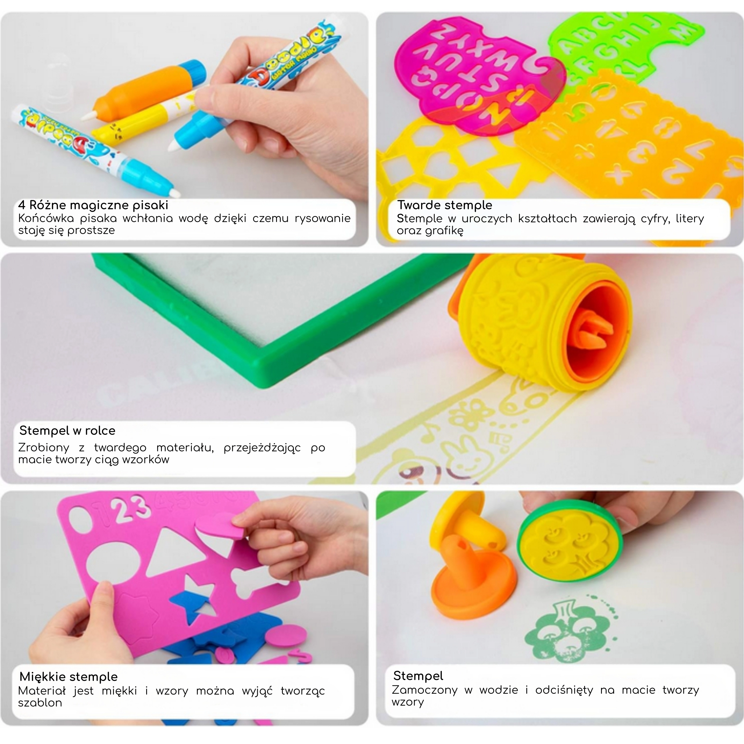 Pachetul include 2 markere cu apă, o rolă cu mâner, 3 ștampile și 2 șabloane educative, care extind posibilitățile de creație. Covorașul este ușor, compact și fabricat din materiale sigure, netoxice și certificate. Utilizarea acasă sau în grădină stimulează creativitatea, coordonarea mână–ochi și competențele lingvistice, totul prin joc.