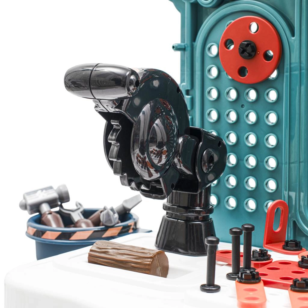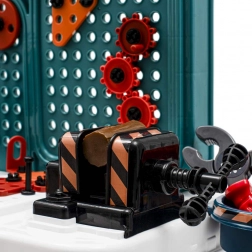 Copiii pot prinde în siguranță piesele și pot exersa folosirea corectă a uneltelor pe blatul robust, cu suporturi practice.