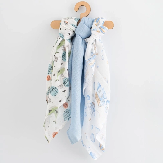 Set practic de scutece pentru copii NEW BABY, cu 3 bucăți de scutece din bumbac de calitate, cu dimensiunile 70 × 80 cm – două cu imprimeu și una uni. Scutecele din 100% bumbac sunt fine cu pielea bebelușului, respirabile și igienice. Datorită utilizării universale, sunt potrivite pentru înfașare și schimbat, ca suport sub căpușor și pentru cărucior sau pătuț. Culori și motive potrivite pentru băieței.