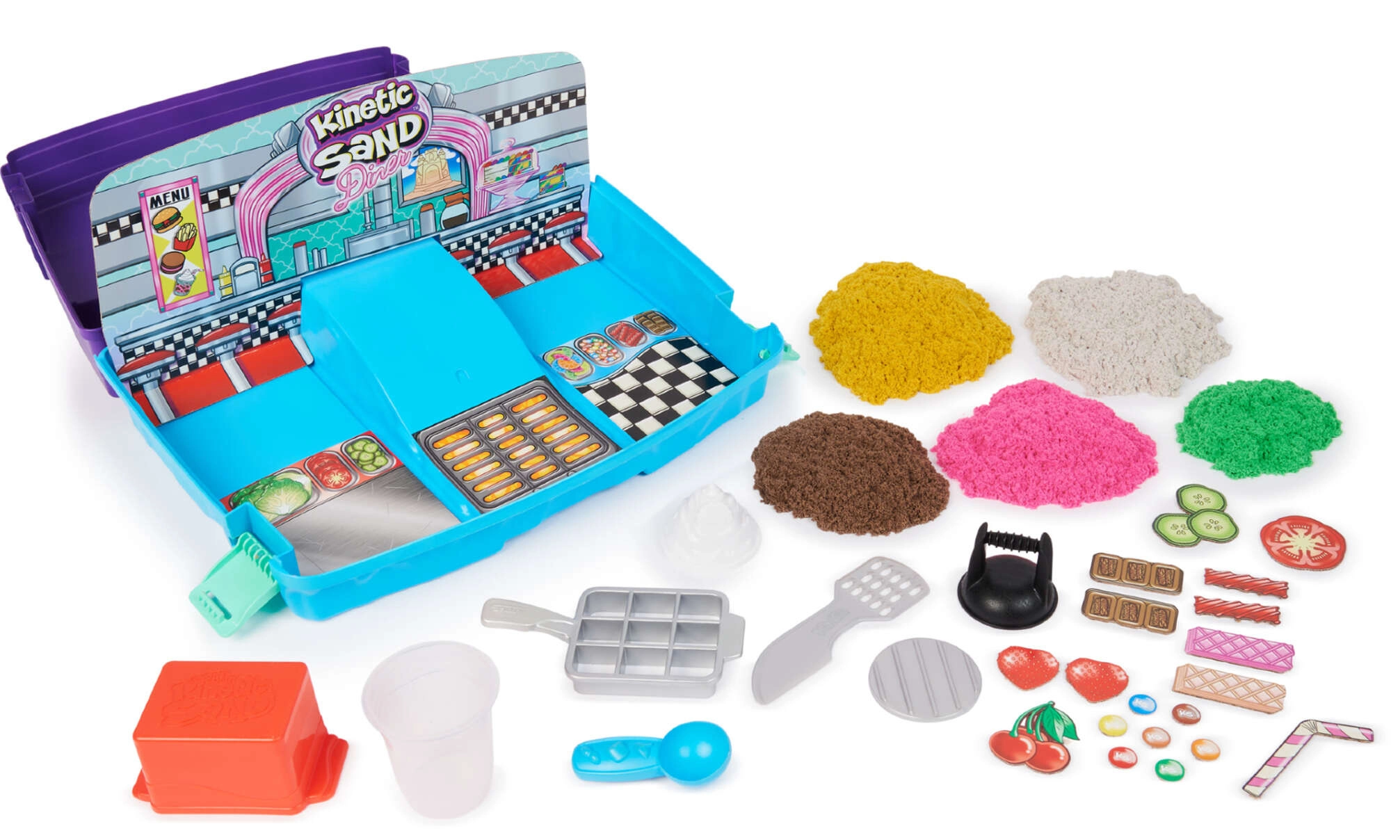 Setul Kinetic Sand Grill N’ Scoop Diner îi va încânta pe micii bucătari și pe iubitorii de activități creative. Deschide valiza turcoaz și se transformă într-o scenă tematică „diner” cu grătar, forme și unelte. Nisipul colorat se poate lua ușor cu lingura, presa și modela în burgeri, cartofi prăjiți, vafe sau cupe de înghețată – imaginația nu are limite.
