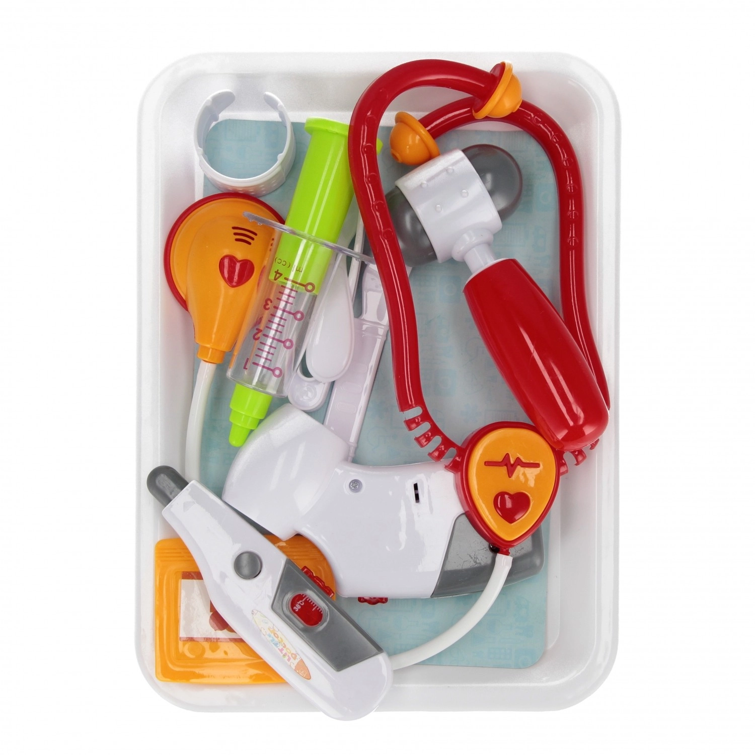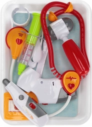 Pachetul include tavă, stetoscop, seringă, pensetă, plasture, cuțitaș, linguriță, ciocănel reflex, pulsoximetru, termometru și legitimație de identificare. Ideal pentru joacă în comun între frați și prieteni și pentru primele cunoștințe cu mediul medical prin joc de imitație sigur.