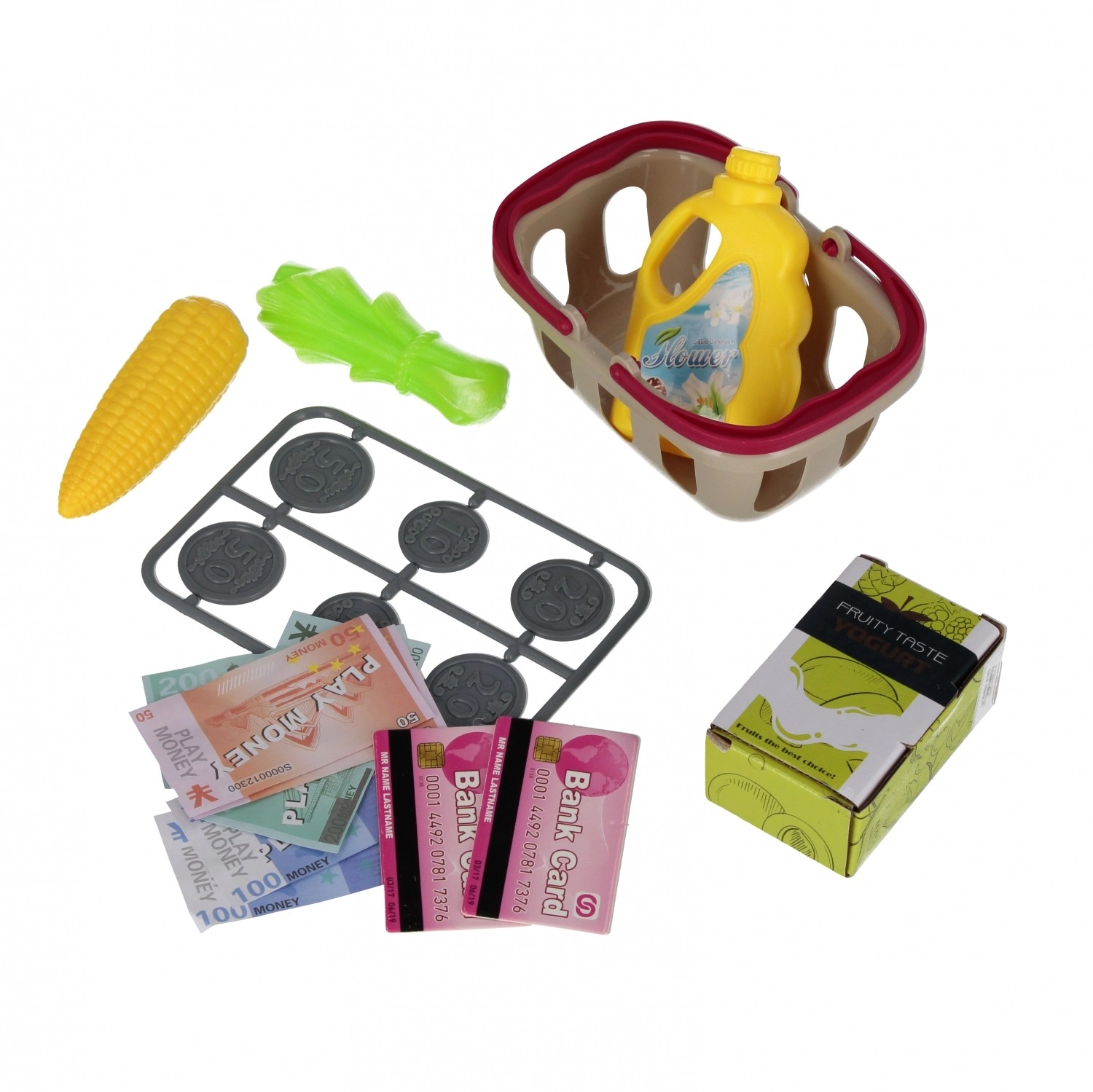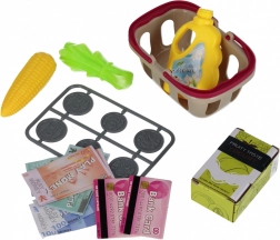 Sunt incluse alimente din plastic, coșul de cumpărături, bancnote și monede de joc – tot ce este necesar pentru un joc complet de magazin.