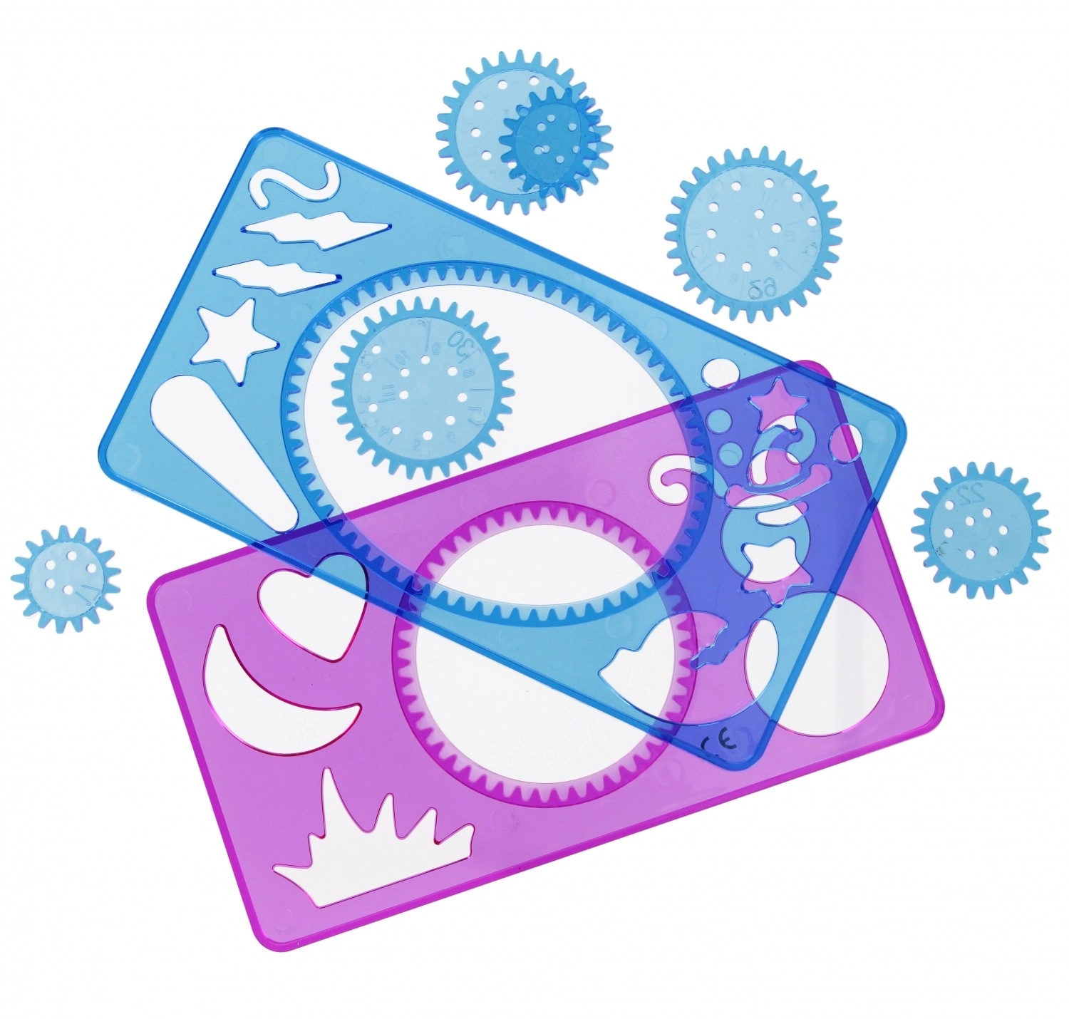 Două plăci solide și transparente, cu inele și forme zimțate, permit ghidarea precisă a rotițelor și linii curate chiar și pentru modele complexe.