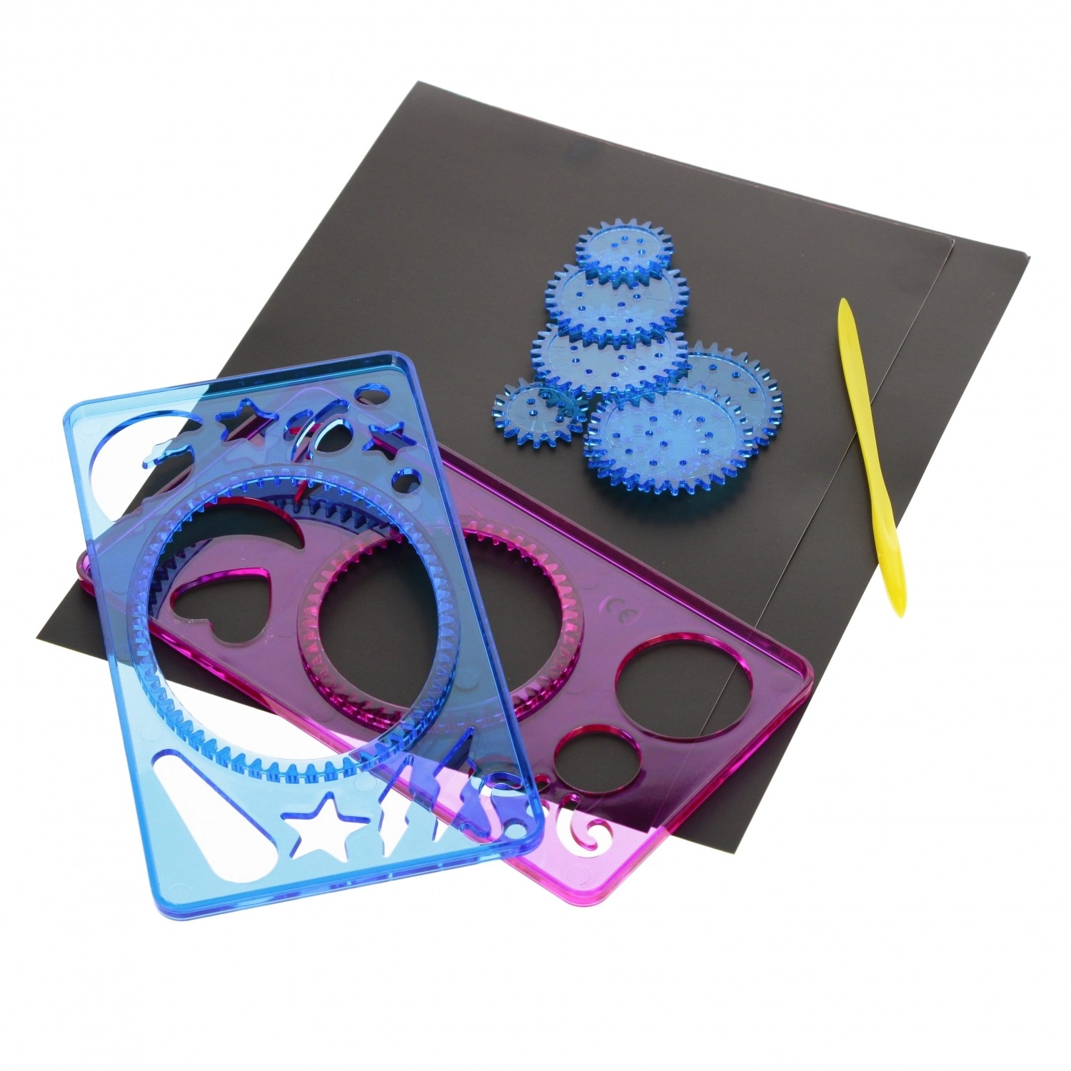 Setul include șabloane, rotițe dințate, stylus/creion și foi de hârtie – începe să creezi imediat după deschidere, fără achiziții suplimentare.