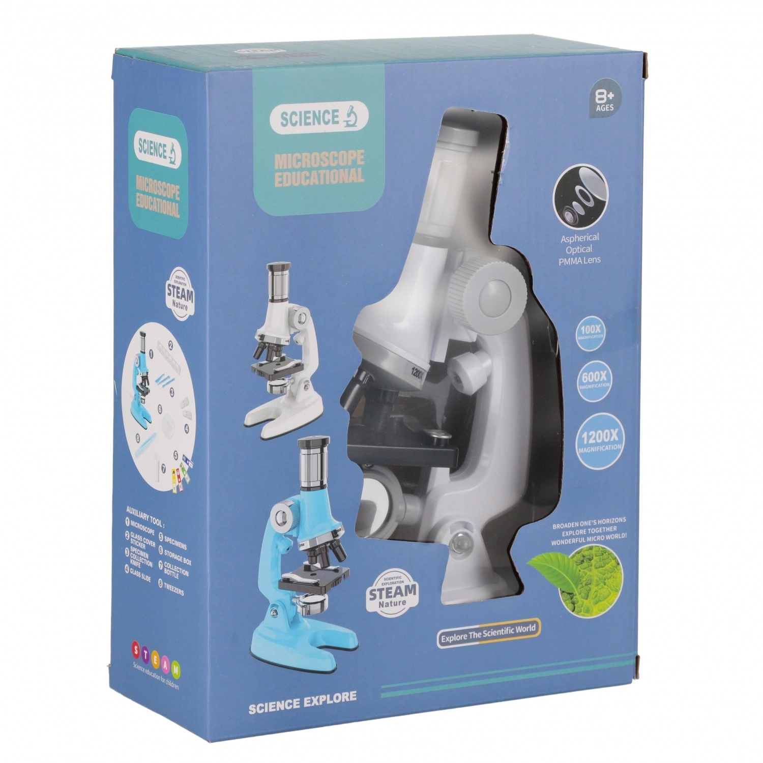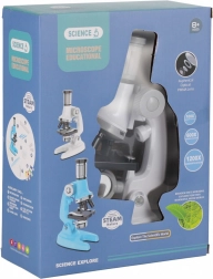 - Set complet: microscop, 1× pensetă, 3× lame/lameluțe pentru preparate, 2× eprubete, 1× cutiuță, 4× șabloane de cercetare cu desene, 4× șabloane goale, manual