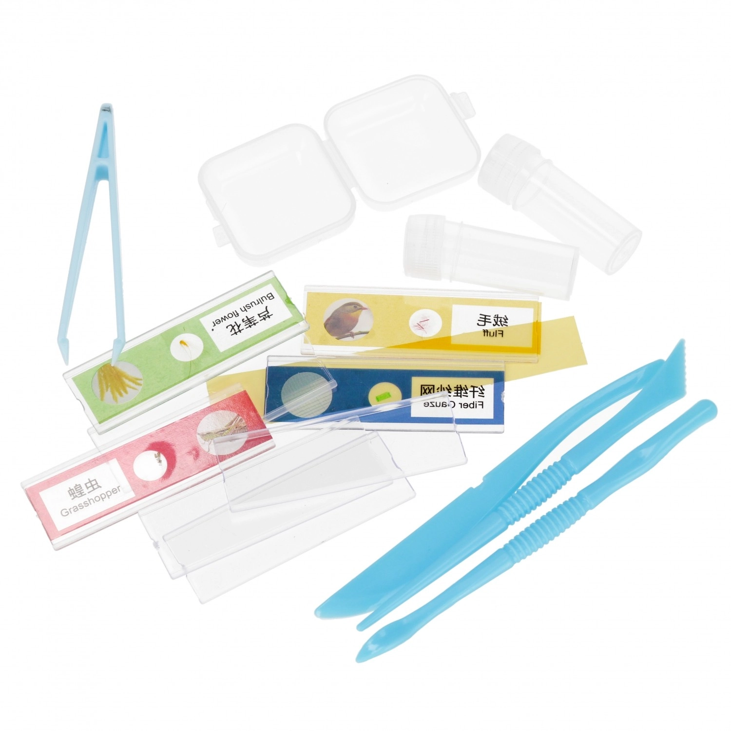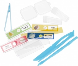 - Microscop, 1× pensetă, 3× lame/lameluțe pentru preparate, 2× eprubete, 1× cutiuță, 4× șabloane de cercetare cu desene, 4× șabloane, manual